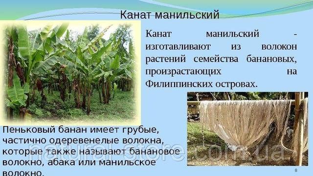 Манільський канат являє собою грубе, рослинна і в міру одеревенелое волокно, яке отримують з бананових або пизанговых рослин (клас ароматичних лілій). Колір коливається від ніжного жовто-бежевого до насиченого світло-коричневого.